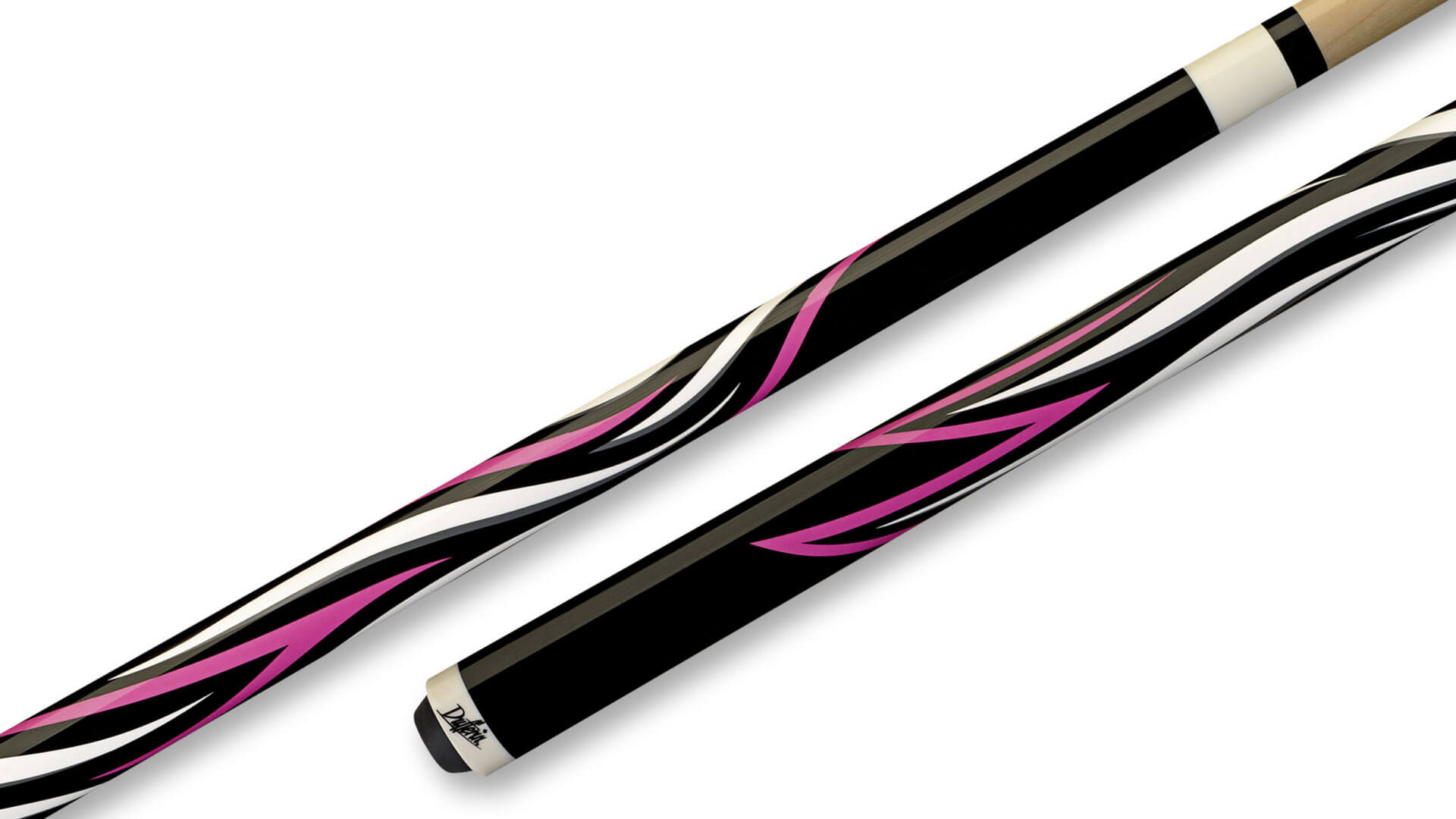 Retired Dufferin cue stick is black with pink and white flame graphics. Wrapless pool cue features 5/16 x 14 joint pin, and 12.75 mm pool cue shaft.