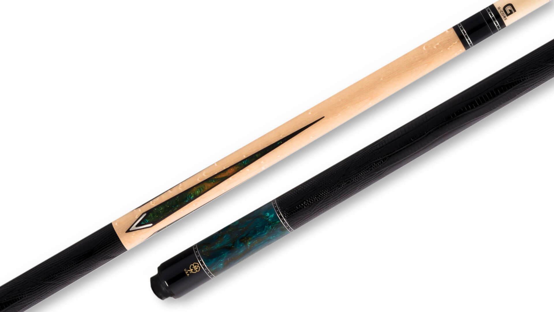 Pool cue constructed with glossy Birdseye Maple wood by McDermott, with silver and index rings, an “Alpha Quartz” gold speck blue/green sleeve, 4 “Alpha Quartz,” black urethane, and pewter points, and a Black Lizard Embossed-Leather wrap. This is a 3/8 x 10  joint cue, with a 13 mm G-Core McDermott shaft with Navigator ‘Black’ medium tip, adjustable weight with McDermott weight bolt, and includes a protective sleeve as well as a limited lifetime warranty.