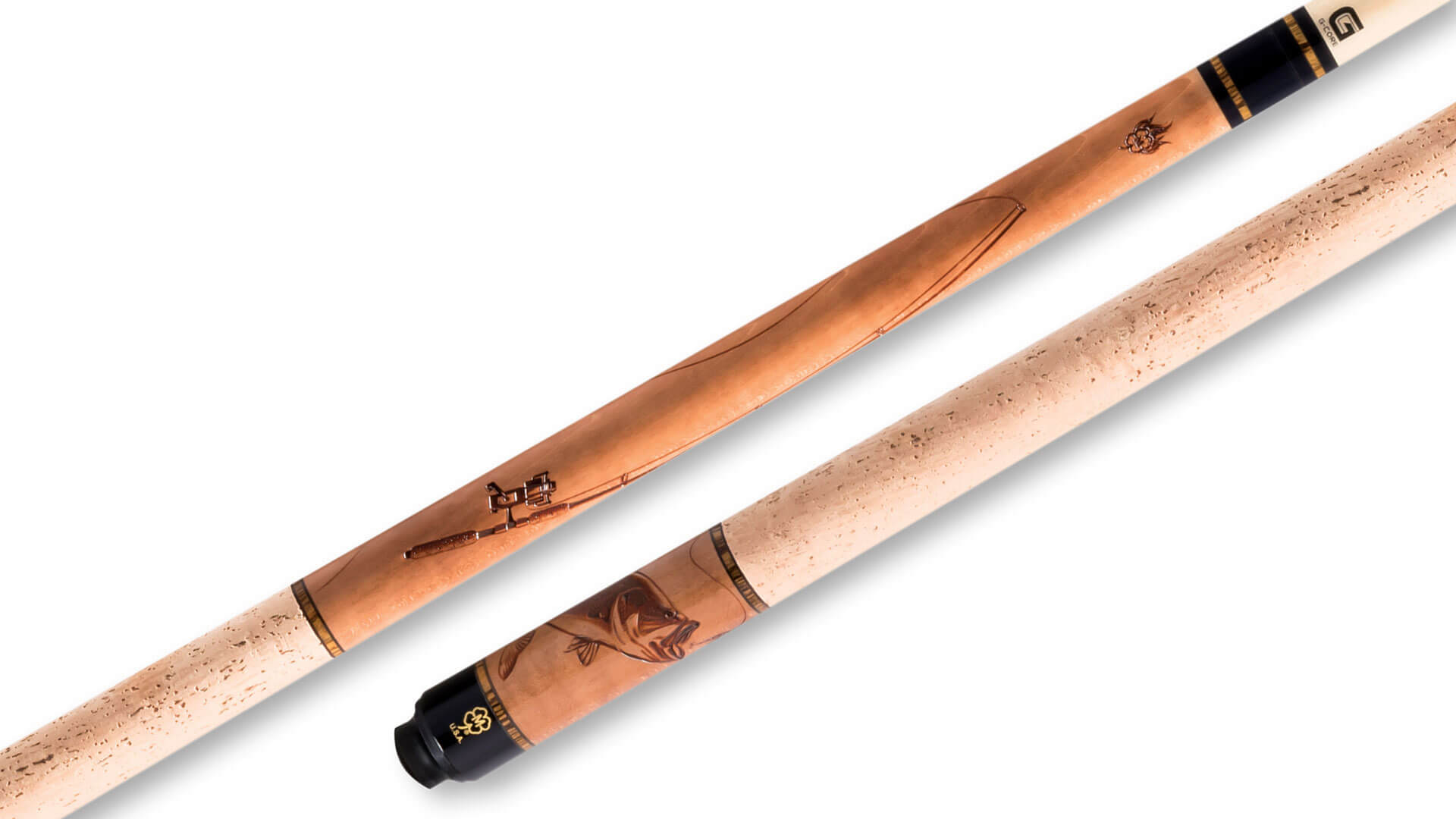 Walnut-stained pool cue from McDermott made using glossy Michigan Maple wood, with Bocote rings, laser-engraved “Fishing” graphics, and a cork wrap. This is a 3/8 x 10 joint cue, with a 13 mm G-Core McDermott shaft with Navigator ‘Black’ medium tip, adjustable weight with McDermott weight bolt, and includes a protective sleeve as well as a limited lifetime warranty.