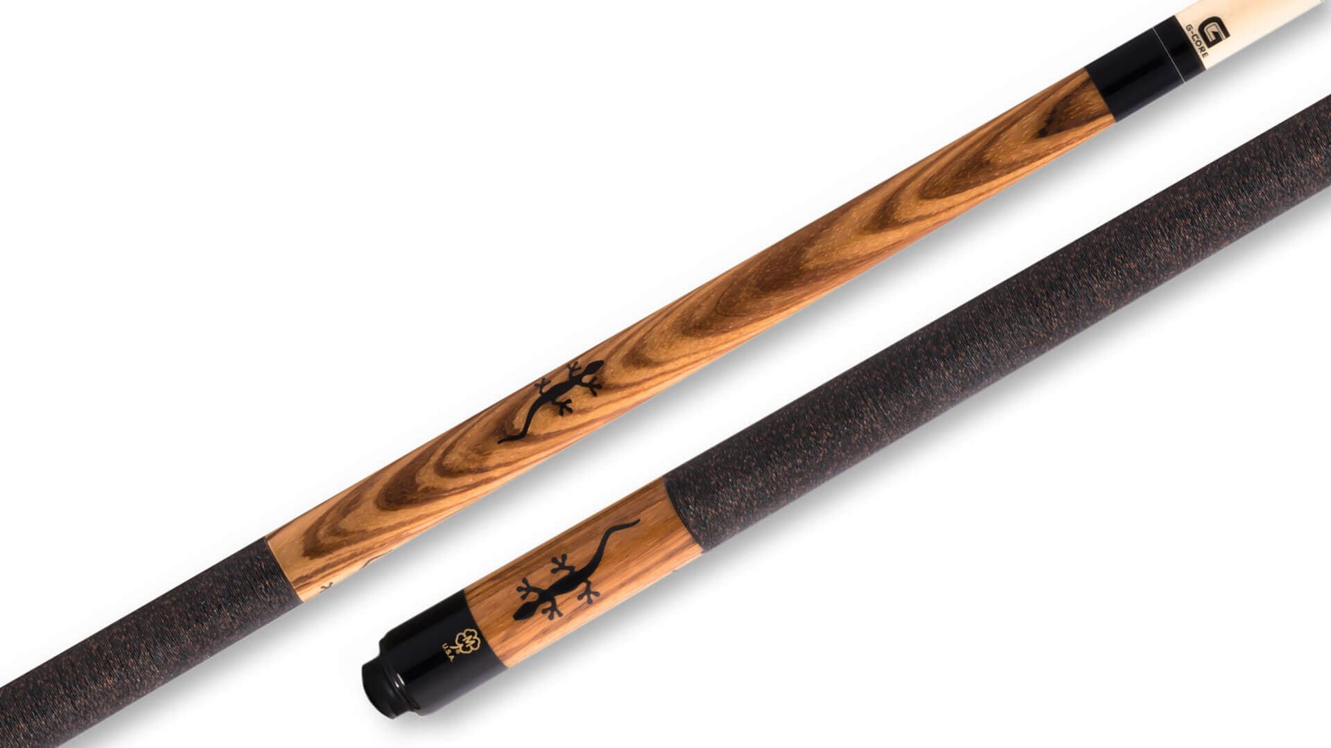Glossy Zebrawood construction pool cue by McDermott has 6 black urethane “Gecko” inlays, and a handle wrapped in black-and-red Irish-Linen. This is a 3/8 x 10 joint cue, with a 13 mm G-Core McDermott shaft with Navigator ‘Black’ medium tip, adjustable weight with McDermott weight bolt, and includes a protective sleeve as well as a limited lifetime warranty.