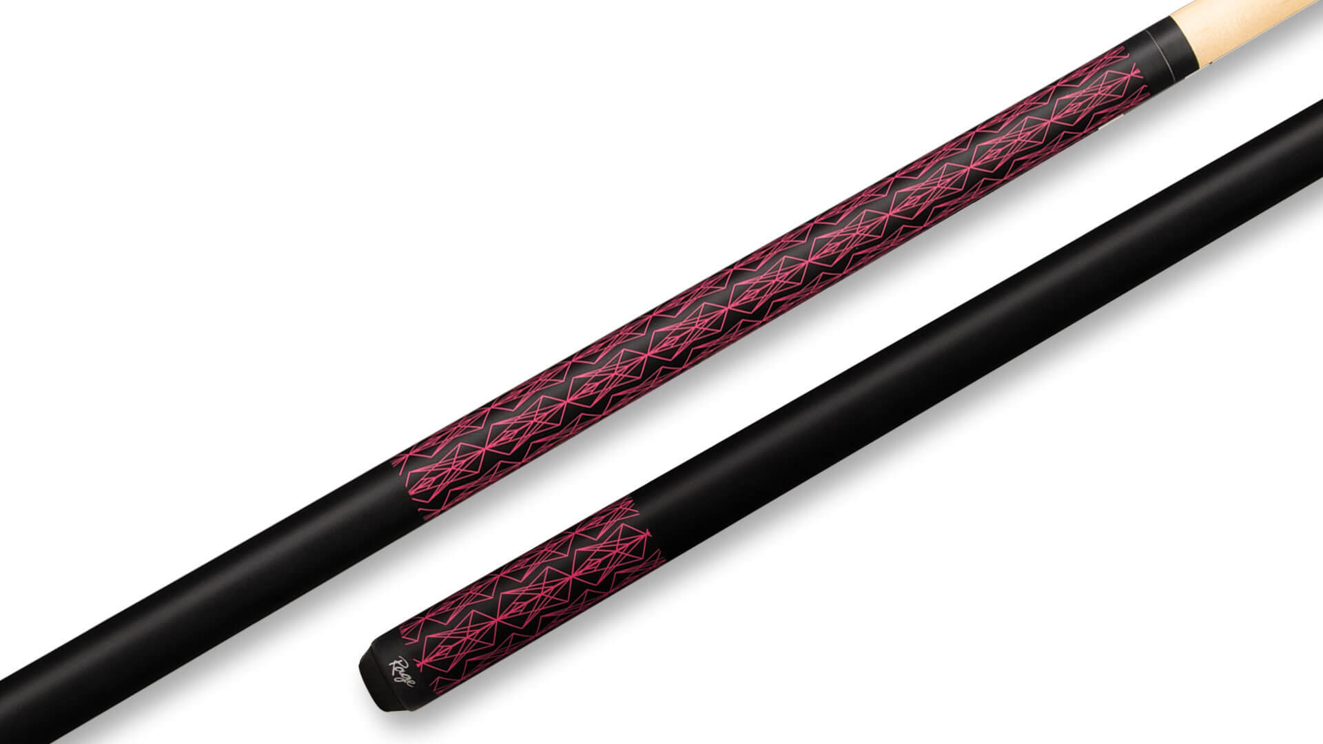 Magenta pool cue by Rage is constructed from Maple wood, with a matte-Black finish and wrapless handle, featuring Metallic-Magenta geometric design graphics. This Rage pool cue features a matte-Black finish transfer, a 5/16×18 joint pin, 12.75mm Maple shaft, and a 13mm Standard Leather Tip.