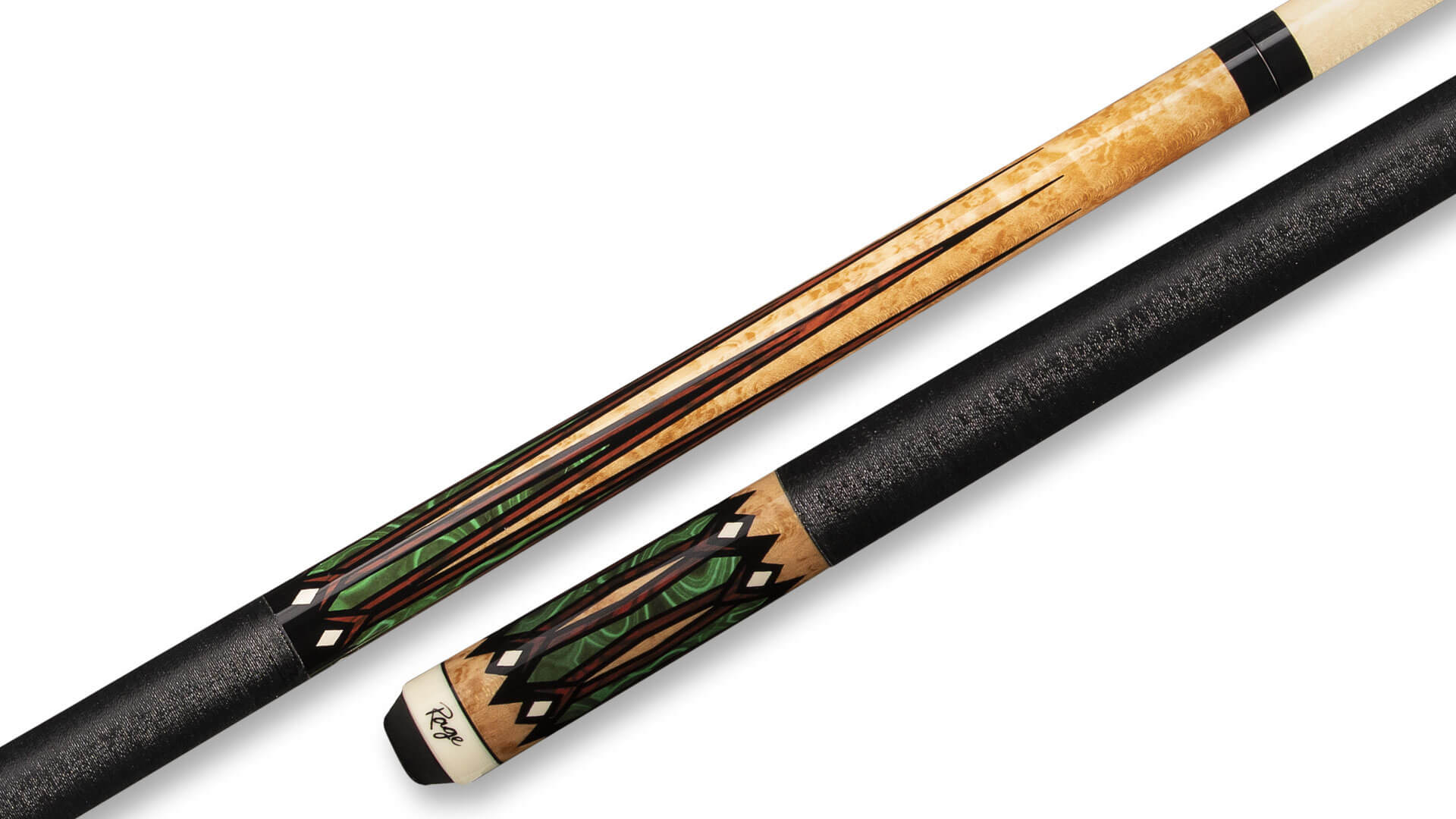 This Rage pool cue is manufactured from glossy Maple wood with exotic wood transfer featuring Exotic Wood and Malachite graphics with a black nylon wrap. This Rage pool cue also features a 13mm Leather Tip, 5/16×18 joint pin, and a 12.75mm Maple shaft.