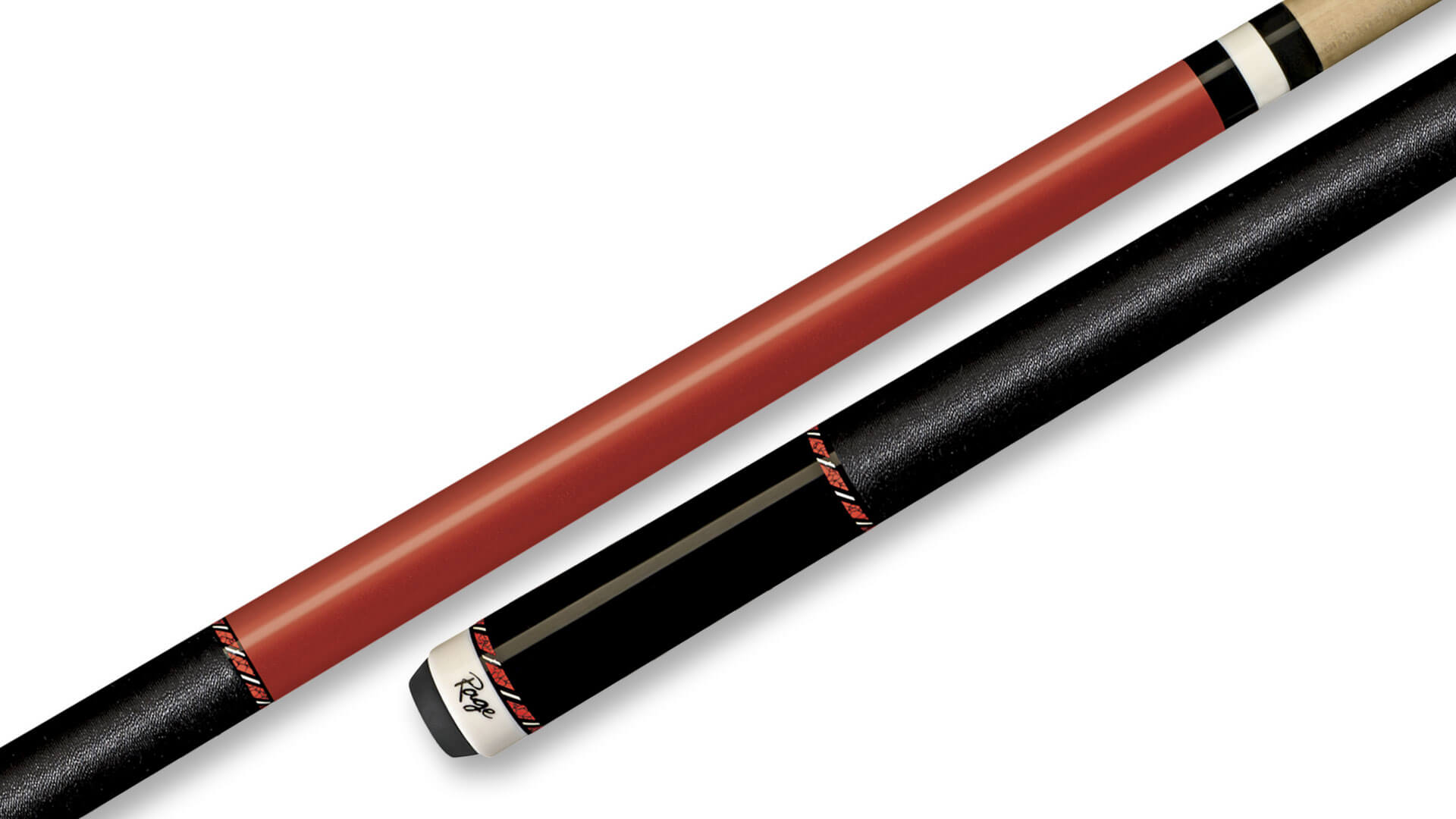 This Rage pool cue stick is constructed from Maple wood with a metallic-red finish, featuring Red-Recon ring graphics, and a black nylon wrap. This red-toned Rage pool cue stick has a 5/16×18 joint, with a 12.75mm Maple shaft, and a Standard Leather Tip.
