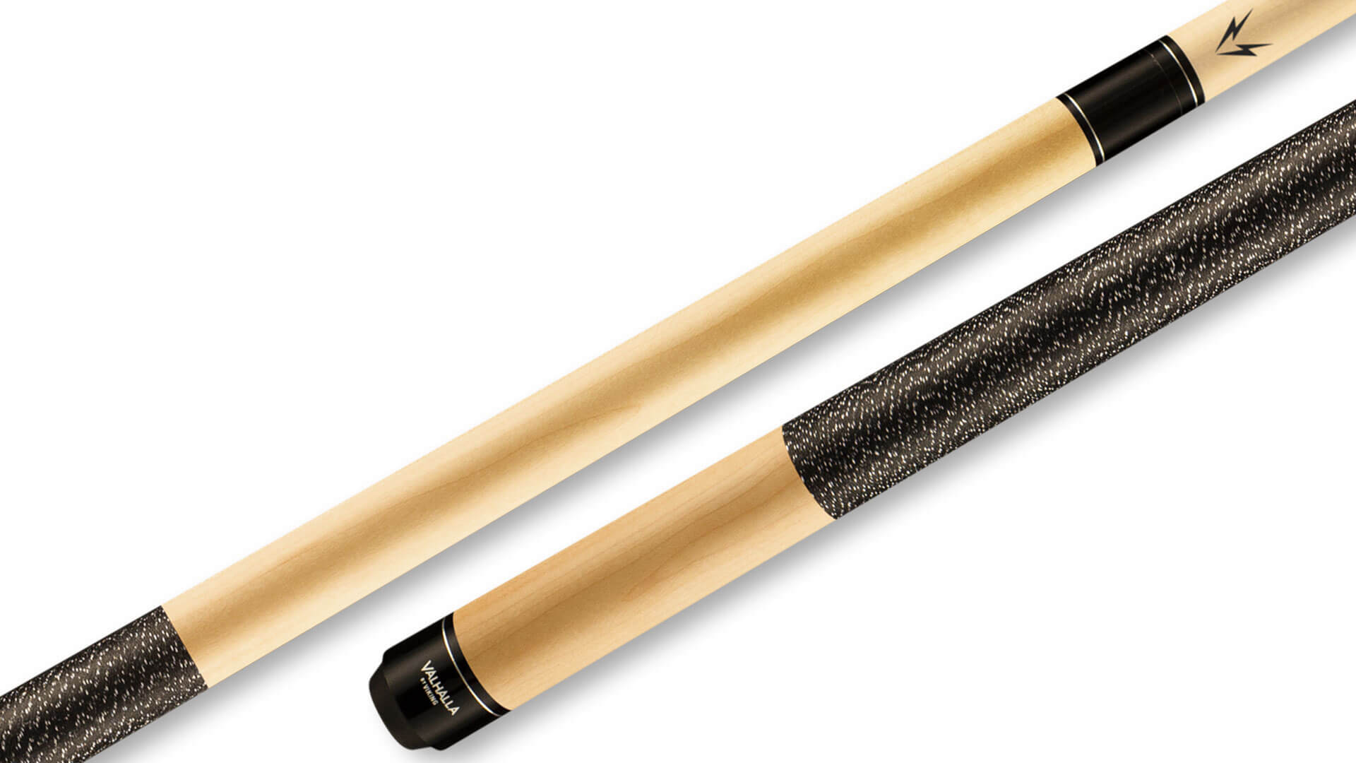 Valhalla pool cue stick made from glossy Maple wood with a natural stain, featuring Nickel Silver rings and a black speckled Irish-linen wrap handle. This Valhalla weight-adjustable pool cue also includes a wood shaft with a standard leather tip, a 5/16 x 18 joint, and a limited lifetime warranty by Valhalla.