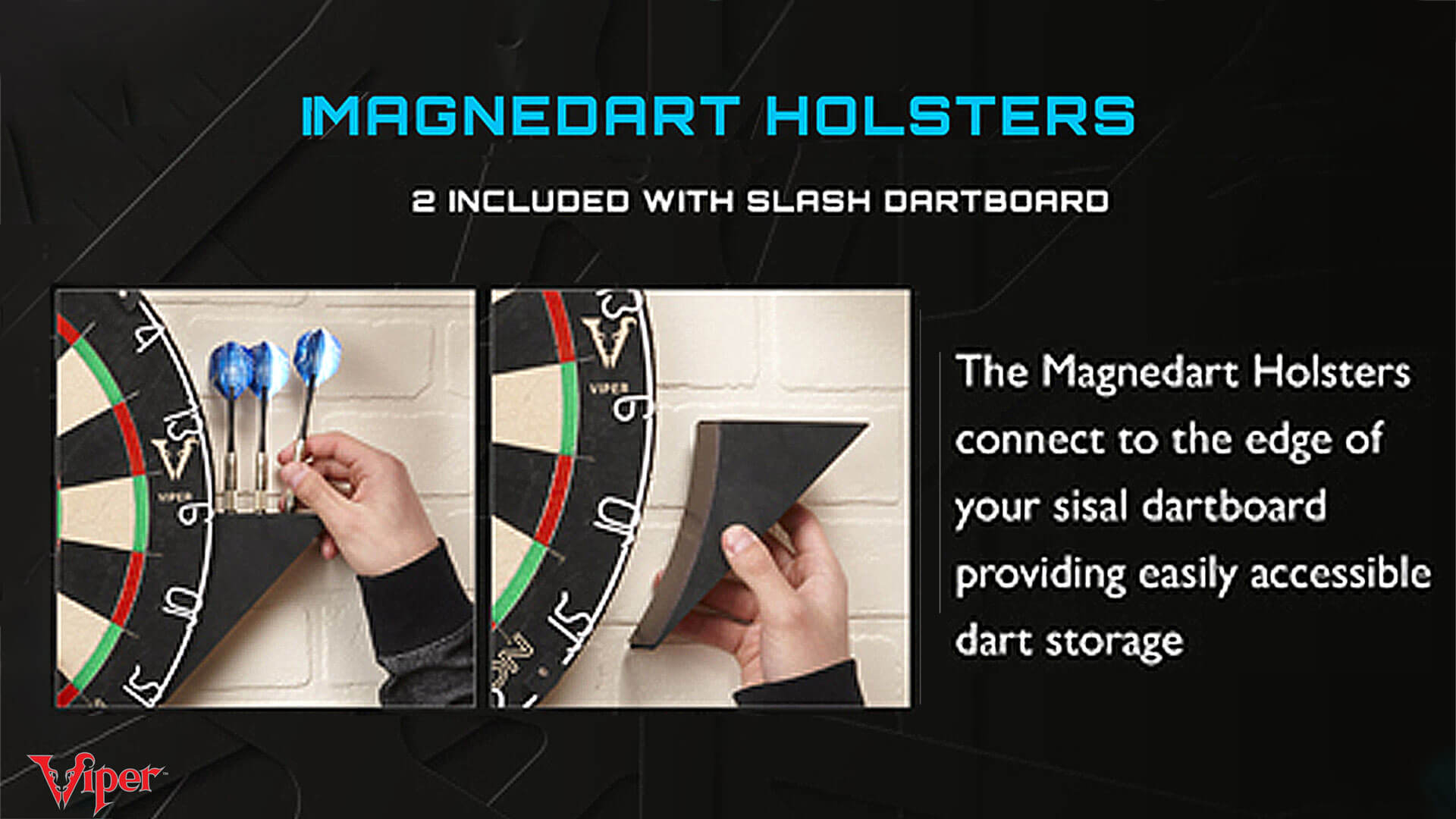 The Viper Slash is our flagship steel tip dart board. This pro dartboard has a regulation size 17.75” diameter and is made with high-grade self-healing African sisal fibers to ensure long-lasting durability. The scoring segments are separated by a razor-thin spider wire that is 100% staple-free, maximizing surface area so your darts don’t bounce-out or deflect off each other. This steel tip dart board features a movable number ring, just detach the ring and rotate your board to reduce wear on the most used sections, significantly extending its life and saving you money! The Viper Slash dartboard also includes a pair of magnetic dart holders that easily mount to the side for convenient storage. Lastly, this dartboard comes with easy to use mounting hardware so you can get ready in no time.