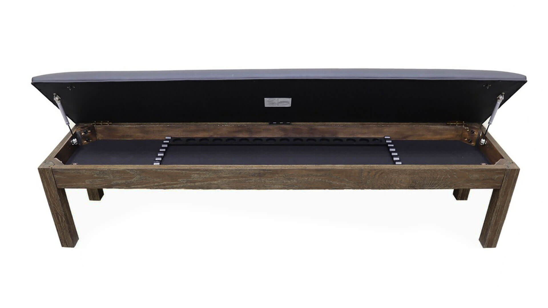 Nixon dining bench, 75-inch with storage capable of holding up to 8 pool cues, is available in a Brushed Walnut finish, and is designed to compliment the Nixon “Hunter” series of pool tables perfectly.