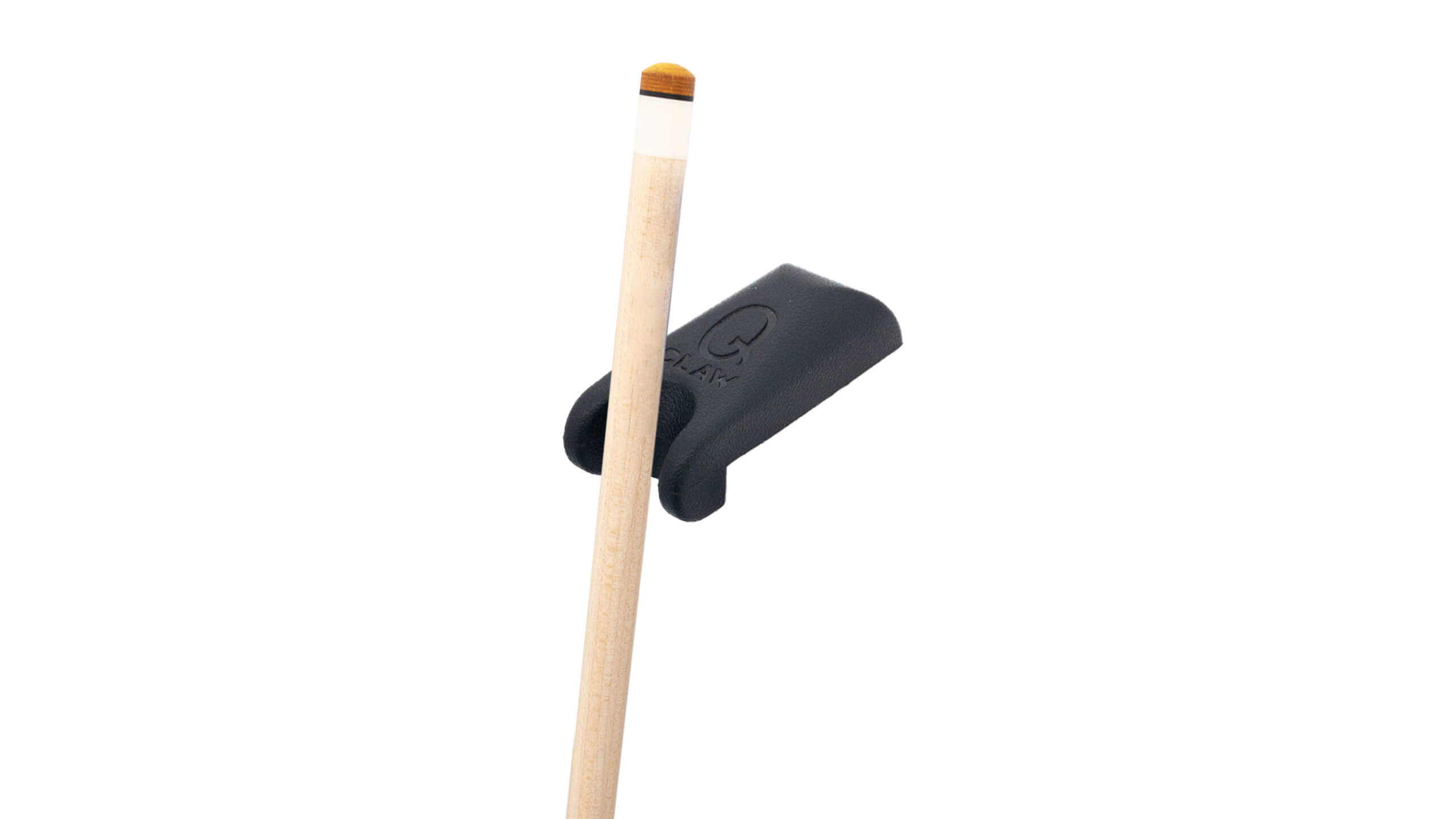 Q-Claw ruggedized pool cue holder designed to hold a single pool cue stick. Black cue holder features a weighted internal core which allows it to be securely placed on any surface.