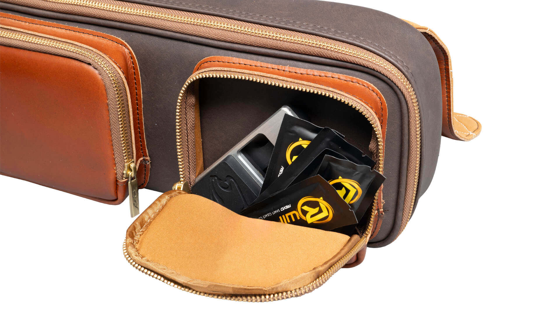 Wrapped in supple light brown full-grain leather, the case delivers an unmistakably upscale feel, enhanced by natural leather grain and a contrast vinyl accent for a striking look. Inside, your cues are cradled in a butterfly-style soft interior, designed to securely hold 3 butts and 5 shafts without bulk or clutter.