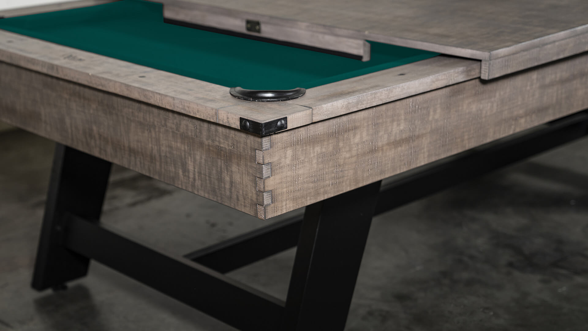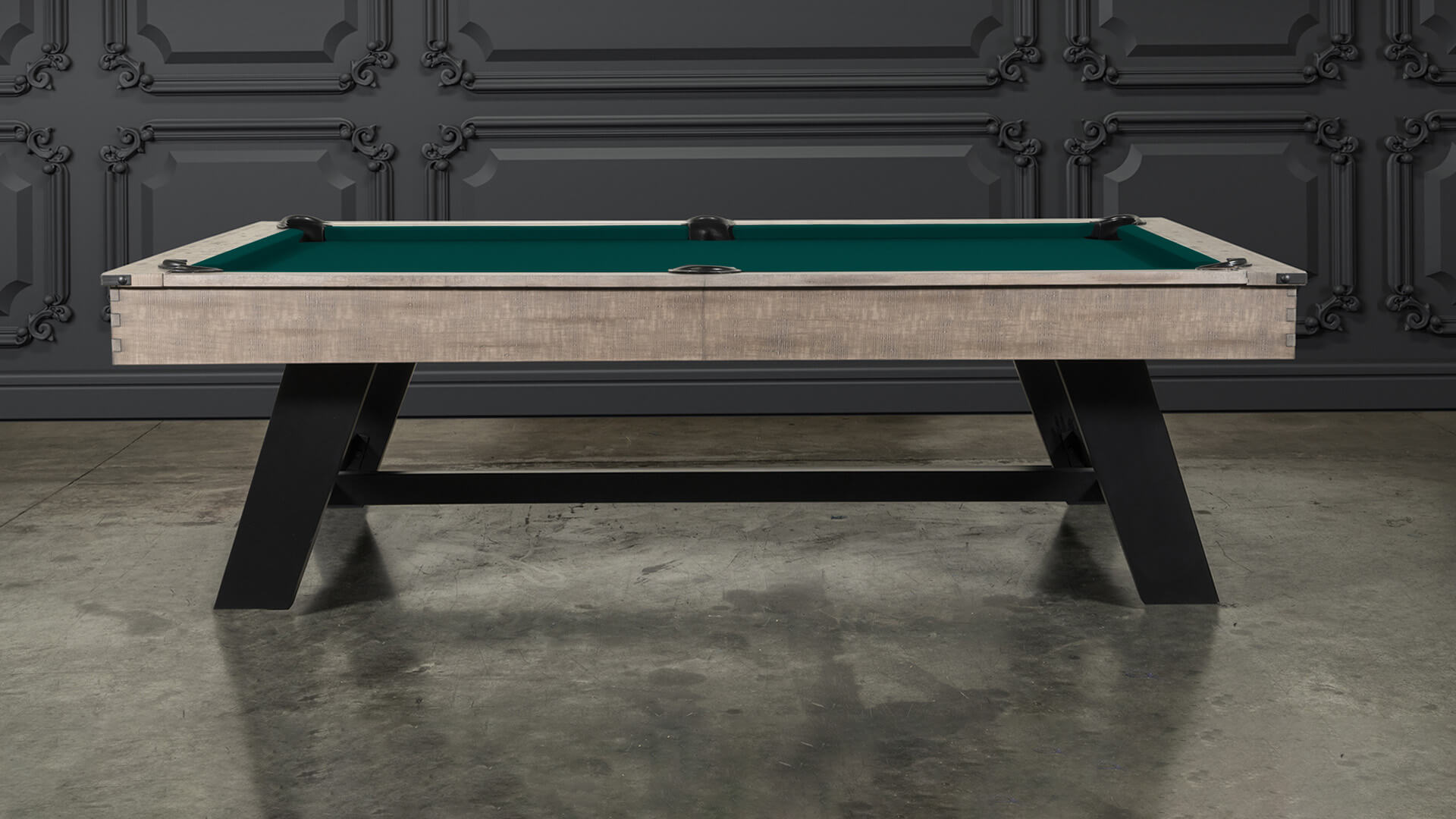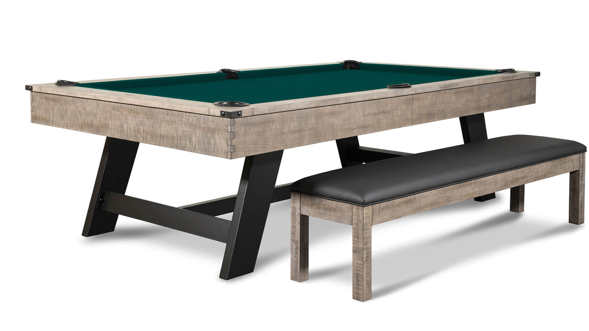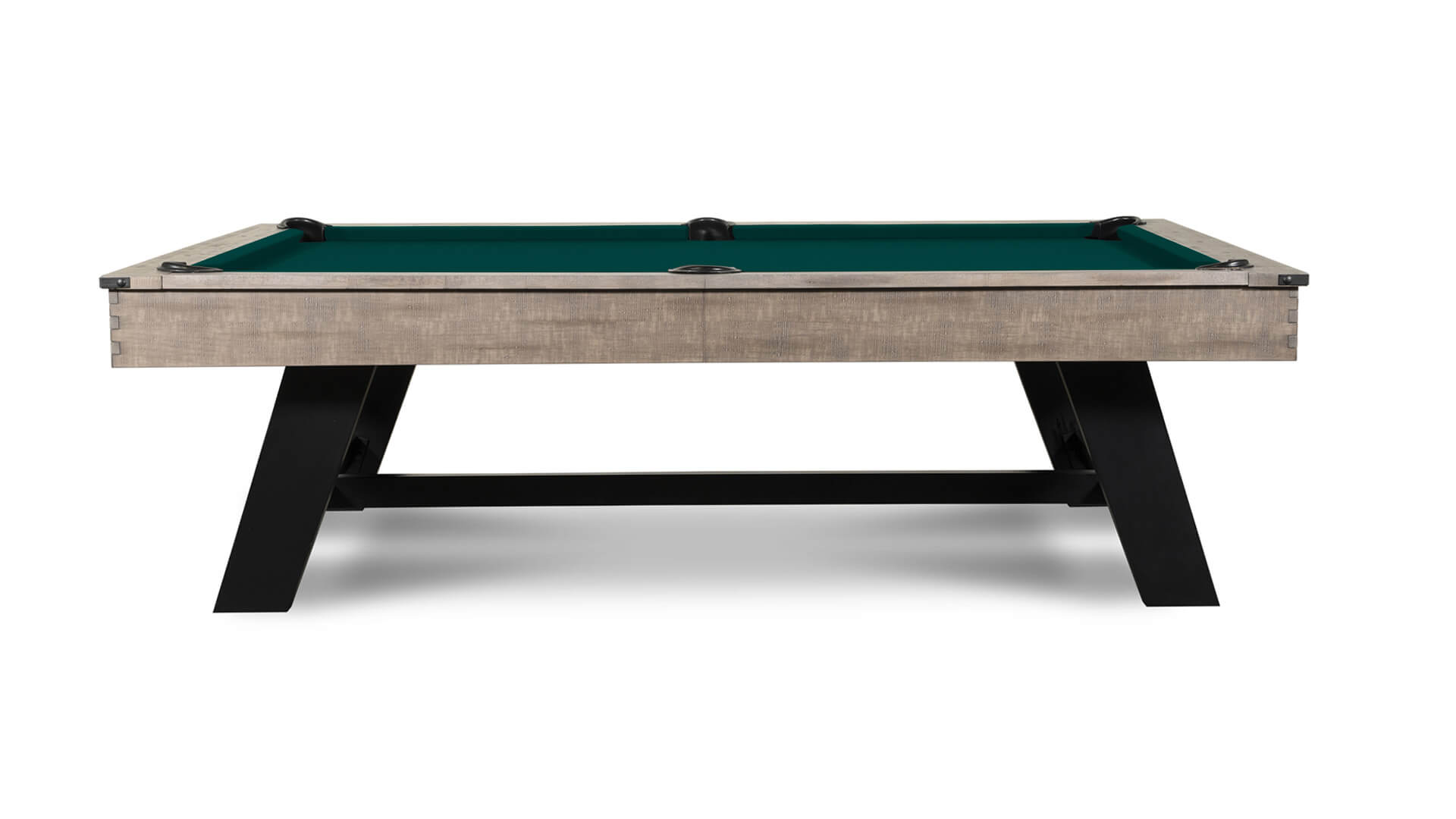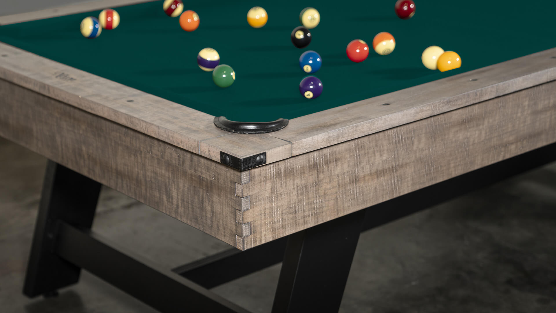 Pool table 7 foot from Nixon Billiards, the “Hunter”, features solid wood construction and a Brushed Walnut finish, with metal legs with a crossbeam support, plus leather drop pockets, and a Modern Industrial design. The Nixon “Hunter” 7 ft bar pool table size is available for sale with 20 felt color options, and includes a free 32-piece pool table accessory set.