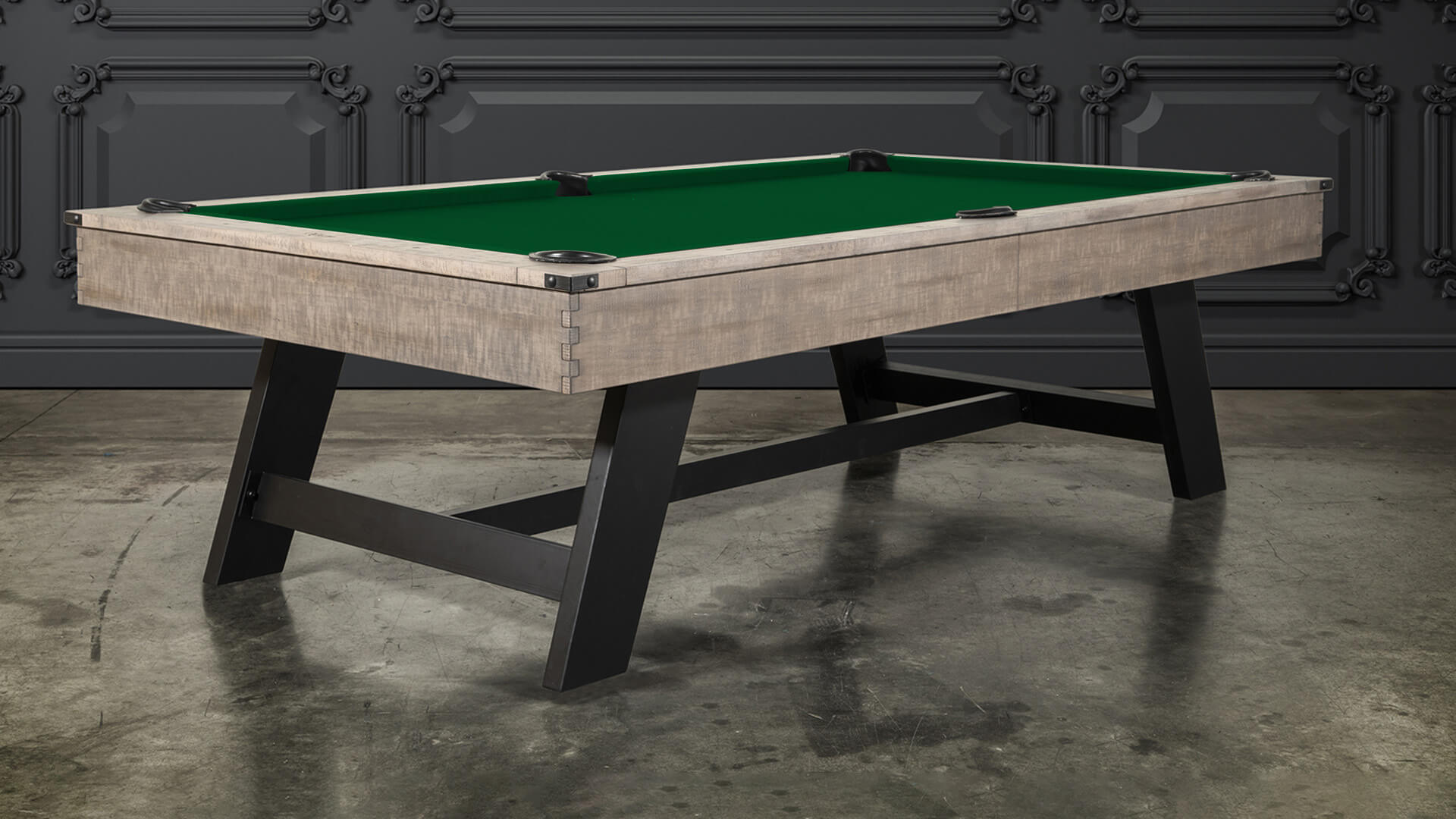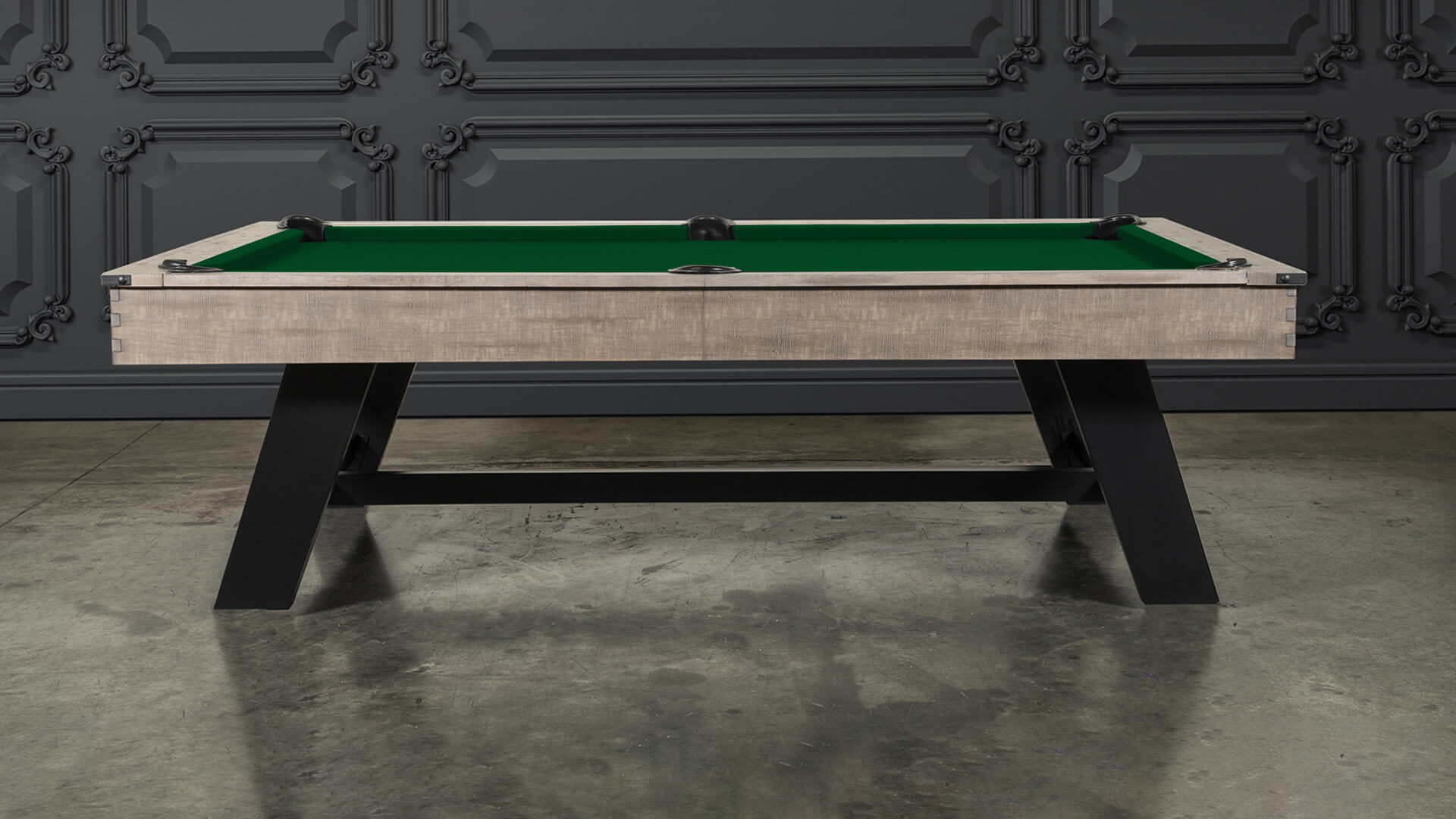 8 foot pool table by Nixon Billiards, the “Hunter” pool table features solid wood construction and a Brushed Walnut finish, with Metal legs and a crossbeam base, plus leather drop pockets, and designed with Modern Industrial stylings. The Nixon “Hunter” regulation pool table is available for sale with 20 felt color choices, and includes a free 32-piece pool table accessory set.