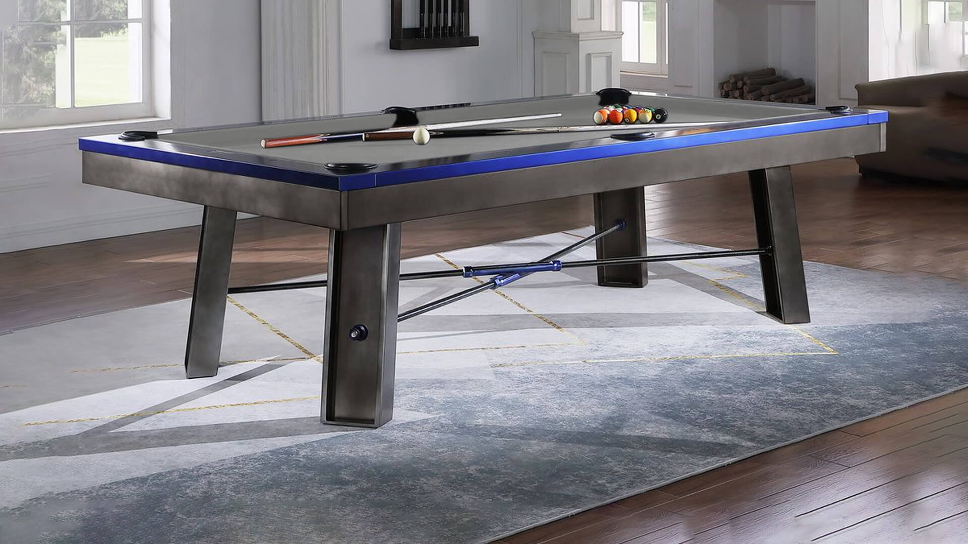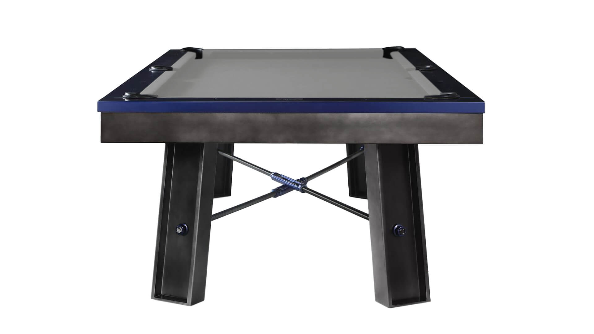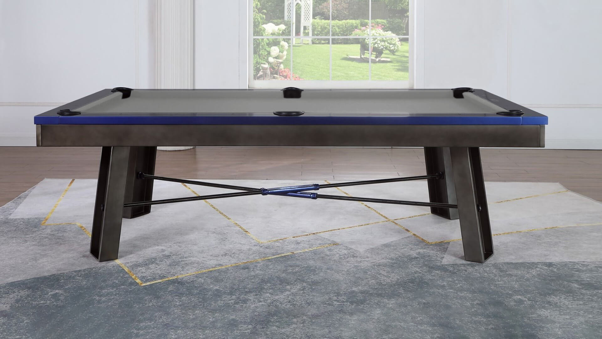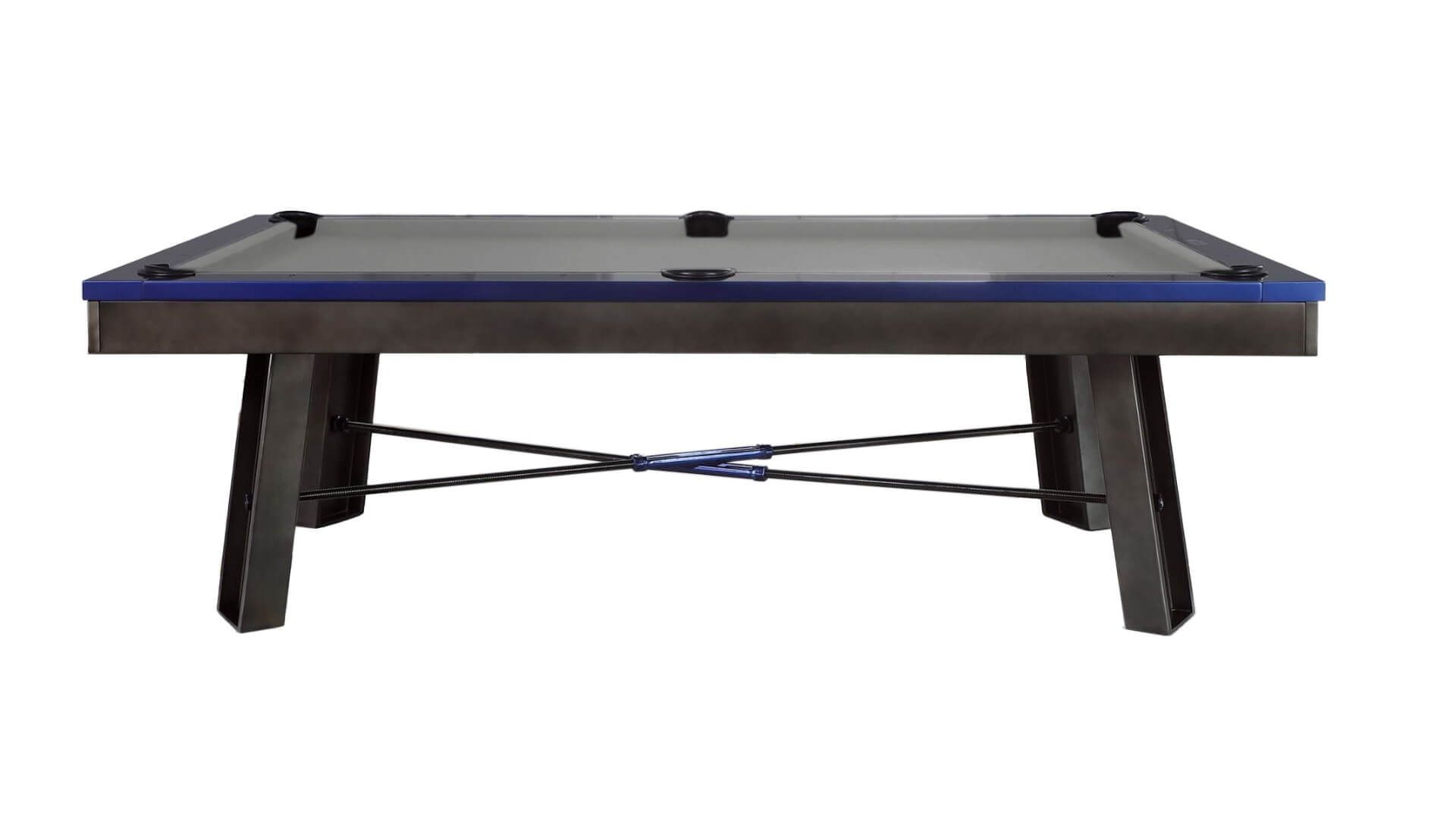 Plank and Hide Metal pool table for sale, the “Maddox”, is constructed from solid Steel with a Gunmetal Grey finish, and Electric Blue rails. This pool table for sale by Plank and Hide, the “Maddox” features metal angled legs, internal drop pockets, and has an Industrial Modern pool table styling, plus all Plank and Hide pool tables include 20 different pool table felt options, and can be purchased as an 8ft pool table size, known as a “standard pool table size”.