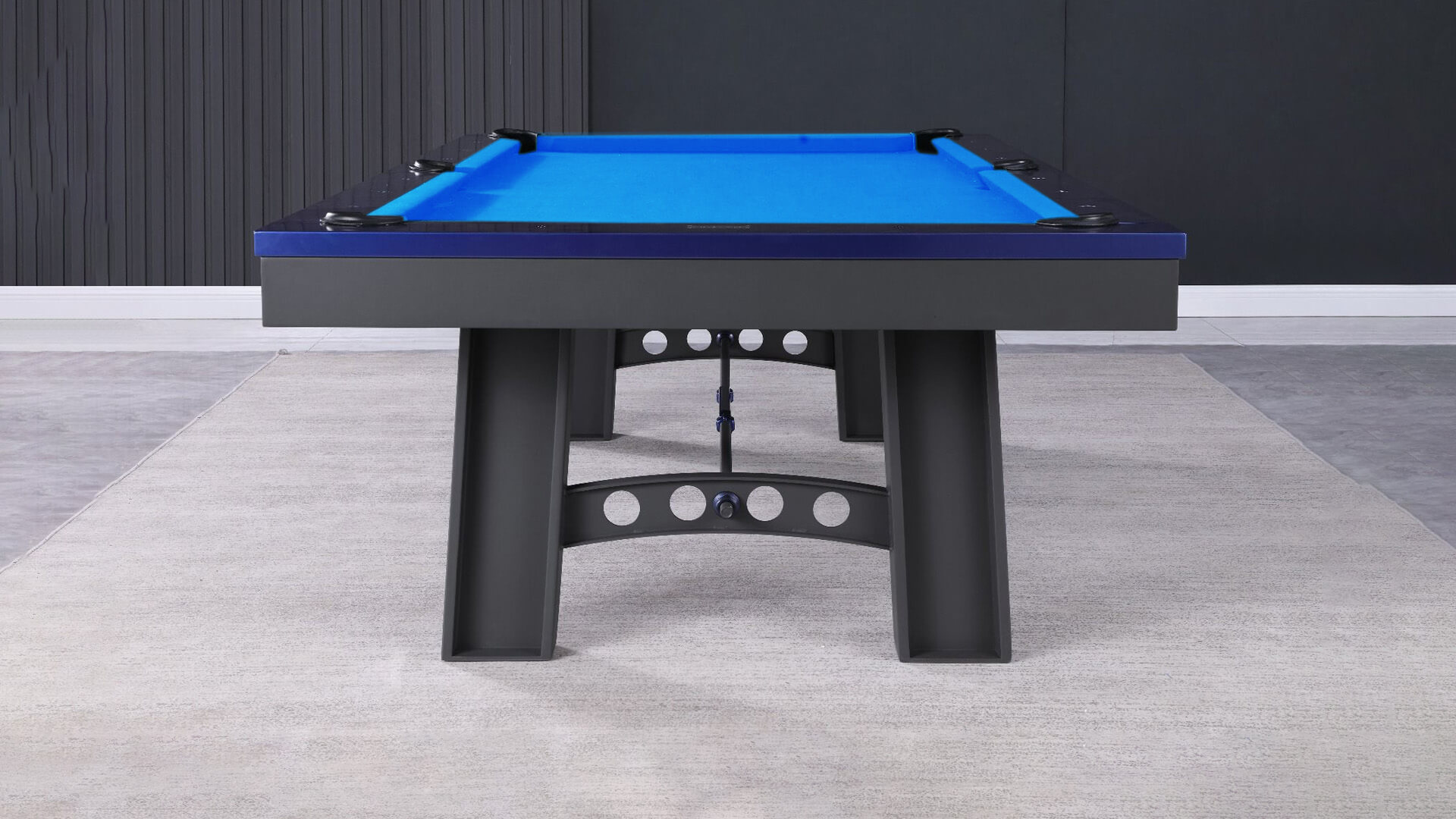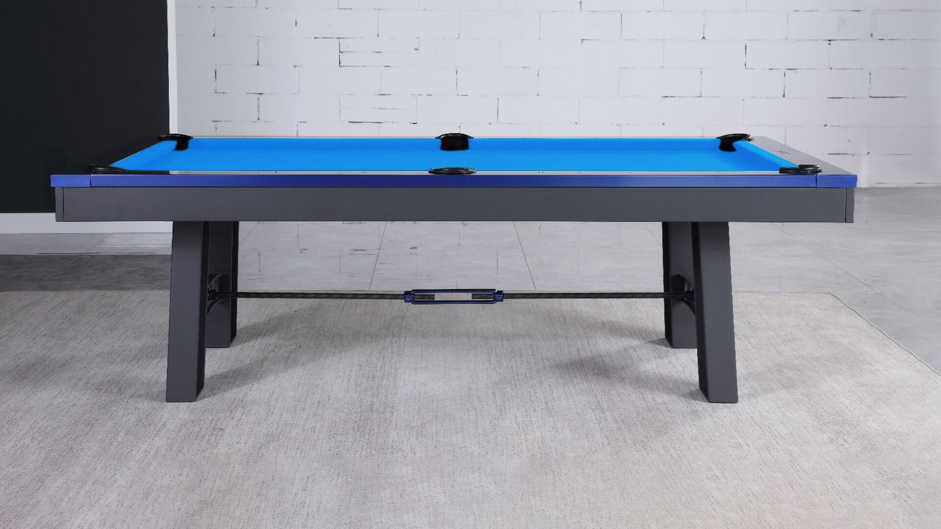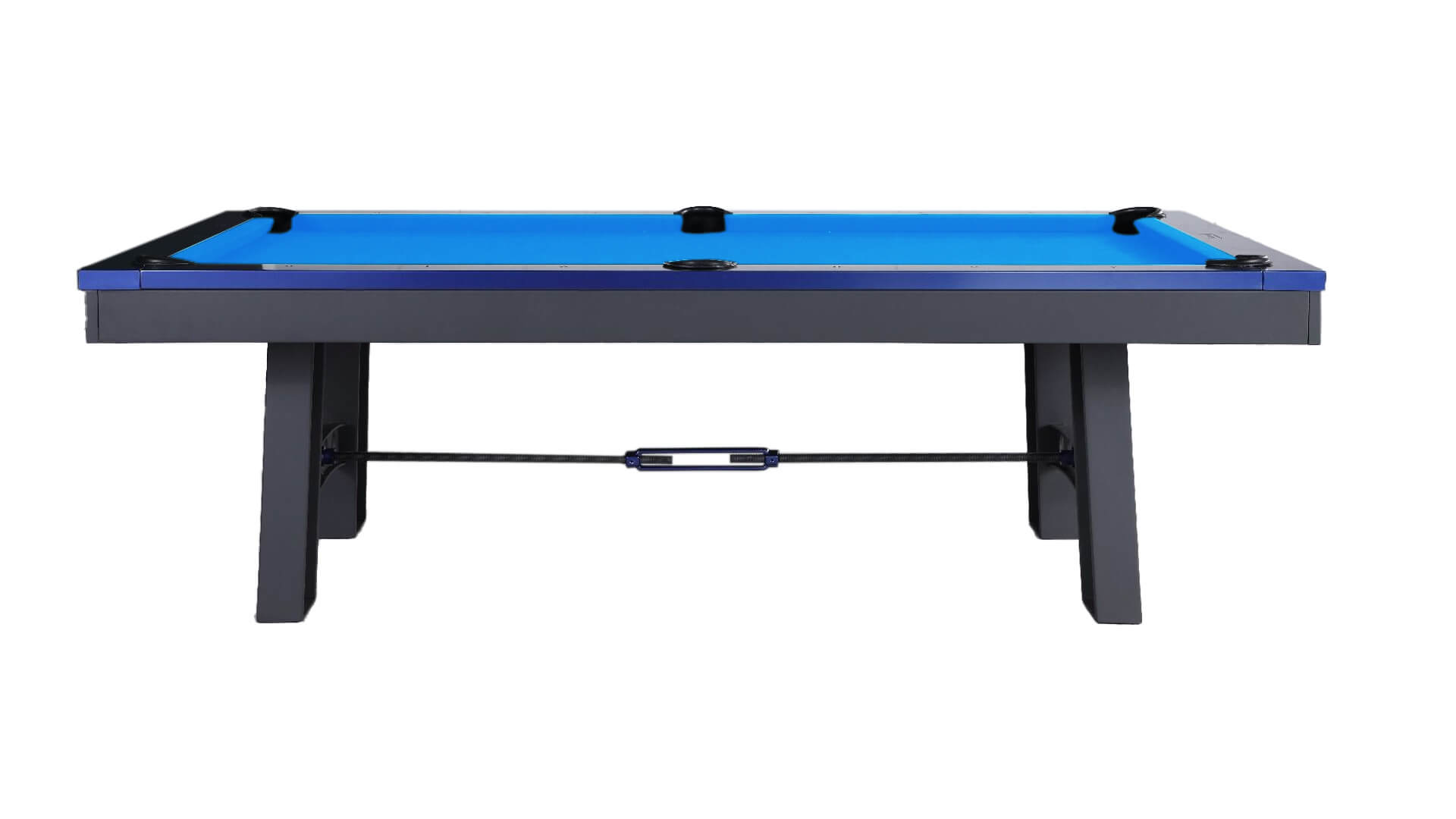 Plank and Hide Metal pool table for sale, the “Xander”, is constructed using solid steel with a Charcoal powder coating and Electric Blue rails. This 3 piece slate pool table from Plank and Hide features a metal base, with internal drop pockets, and a Modern pool table style, plus it can be installed with your choice of 20 pool table felt colors, and this Plank and Hide pool table for sale is available in an 8ft pool table size, which is a “standard pool table size”.