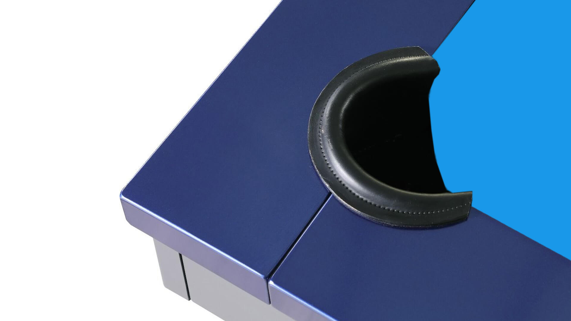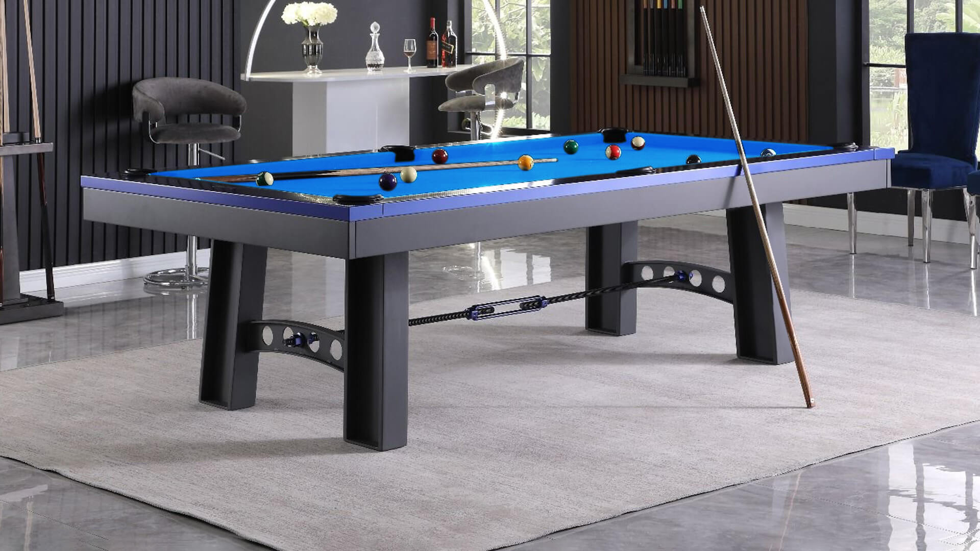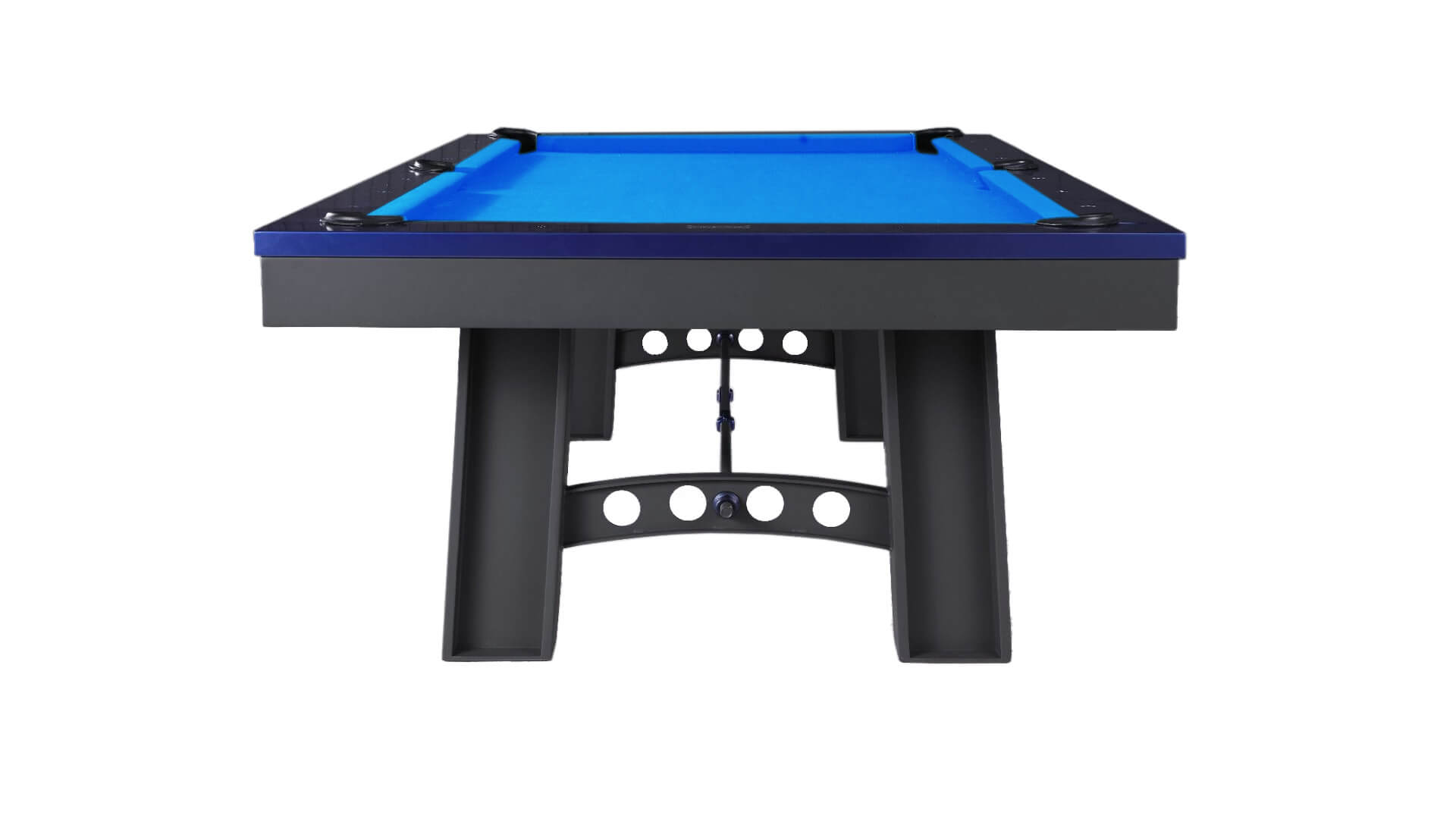 Plank and Hide Metal pool table for sale, the “Xander”, is constructed using solid steel with a Charcoal powder coating and Electric Blue rails. This 3 piece slate pool table from Plank and Hide features a metal base, with internal drop pockets, and a Modern pool table style, plus it can be installed with your choice of 20 pool table felt colors, and this Plank and Hide pool table for sale is available in an 8ft pool table size, which is a “standard pool table size”.